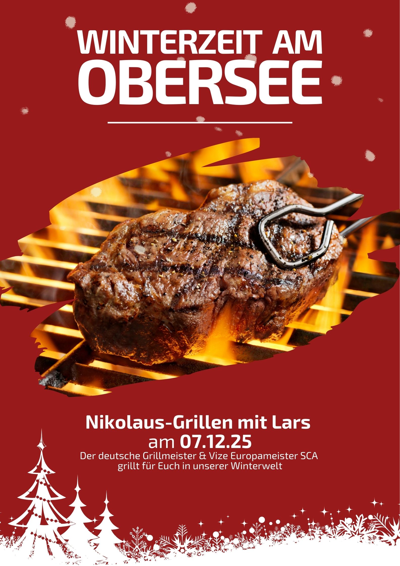 Nikolaus-Grillen mit Lars am 07.12.25. Der deutsche Grillmeister & Vize Europameister SCA grillt für Euch in unserer Winterwelt. Zurück zu Veranstaltungen WINTERZEIT AM OBERSEE WEIHNACHTSFEIER FÜR ALLE HERBSTZEIT AM OBERSEE GRÜNKOHLTAGE